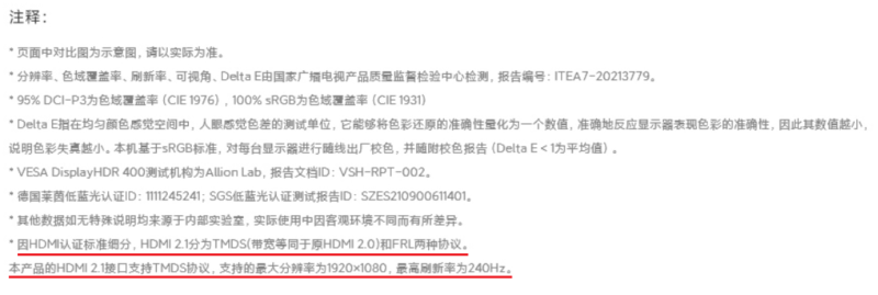 그러나 그 밑에 이용약관에 숨겨진 페이지 하단에 다음(번역) 이라고 쓰여 있습니다. 2.0 및 FRL 프로토콜). 이 제품의 HDMI 2.1 인터페이스는 TMDS 프로토콜을 지원하며 최대 지원 해상도는 1920×1080, 최대 주사율은 240Hz다.
