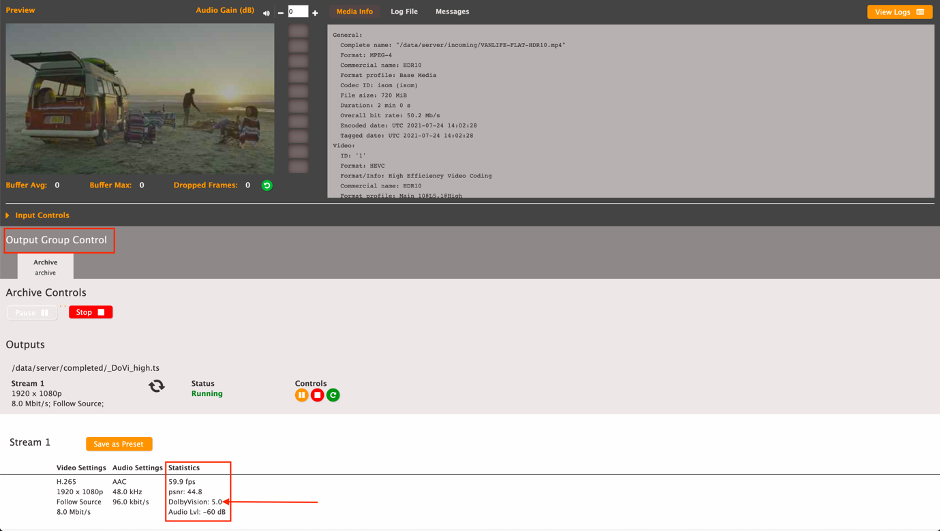 Elemental 인코더에서 채널이 시작되면 이벤트 대시보드 로 이동하여 "Output Group Control"까지 아래로 스크롤합니다. 여기에서 실행 중인 Dolby Vision 프로필 에 대한 통계 섹션을 확인할 수 있습니다 . 다음 예에서 출력 비디오는 Dolby Vision 프로필 5로 처리되었습니다. Dolby Vision 처리가 통계 프롬프트 N/A를 실행하지 않는 경우 .