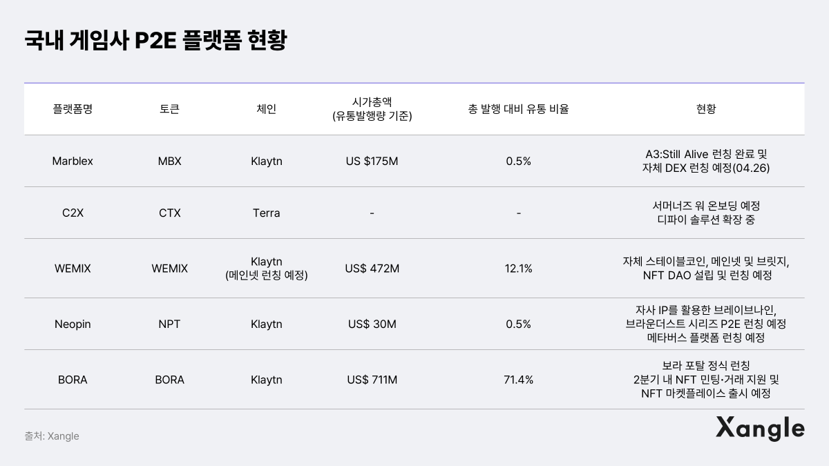 국내 게임사들이 위메이드의 성공을 목도하며 각자의 P2E 플랫폼을 런칭할 것을 알리며 올해 각자의 플랫폼과 자체 토큰을 런칭하였다. 엑시인피티니, 디파이킹덤 등 크립토 태생의 해외 P2E와는 다르게 게임 시장을 차지하고 있던 게임사들이 P2E에 뛰어든 만큼 P2E 업계에도 높은 퀄리티의 P2E가 런칭될 것을 기대하는 이들이 많아졌다.