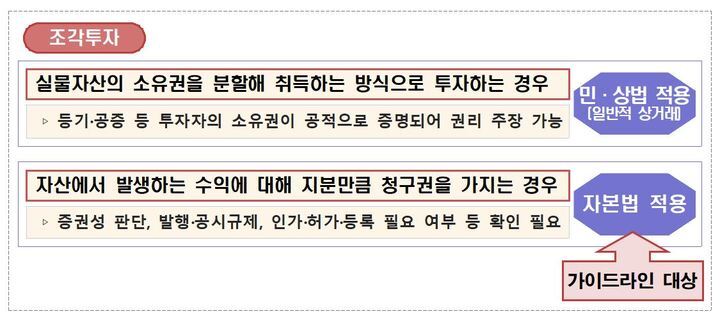 조각투자 중 자산에서 발생하는 수익에 대해 지분만큼 청구권을 가지는 경우 자본법이 적용되며 가이드라인 대상에 해당한다.