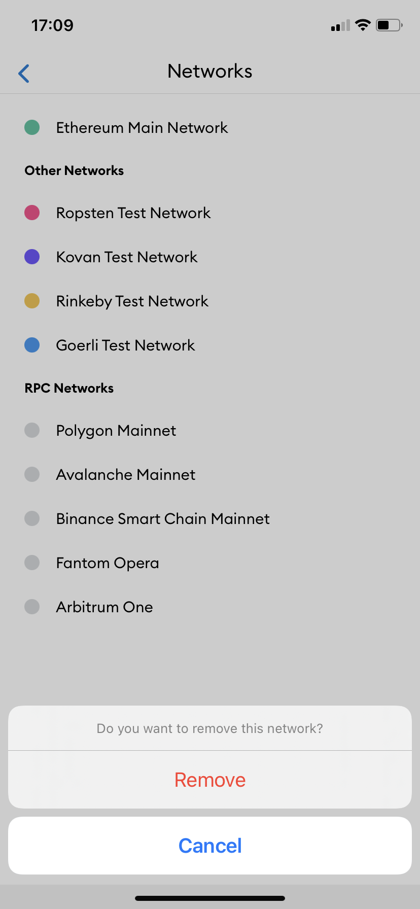 - 이제 이전에 MetaMask에 추가한 네트워크 목록이 표시됨:제거할 네트워크를 길게 눌러 의도를 확인하는 메시지를 표시한 다음 '제거'를 누르십시오.