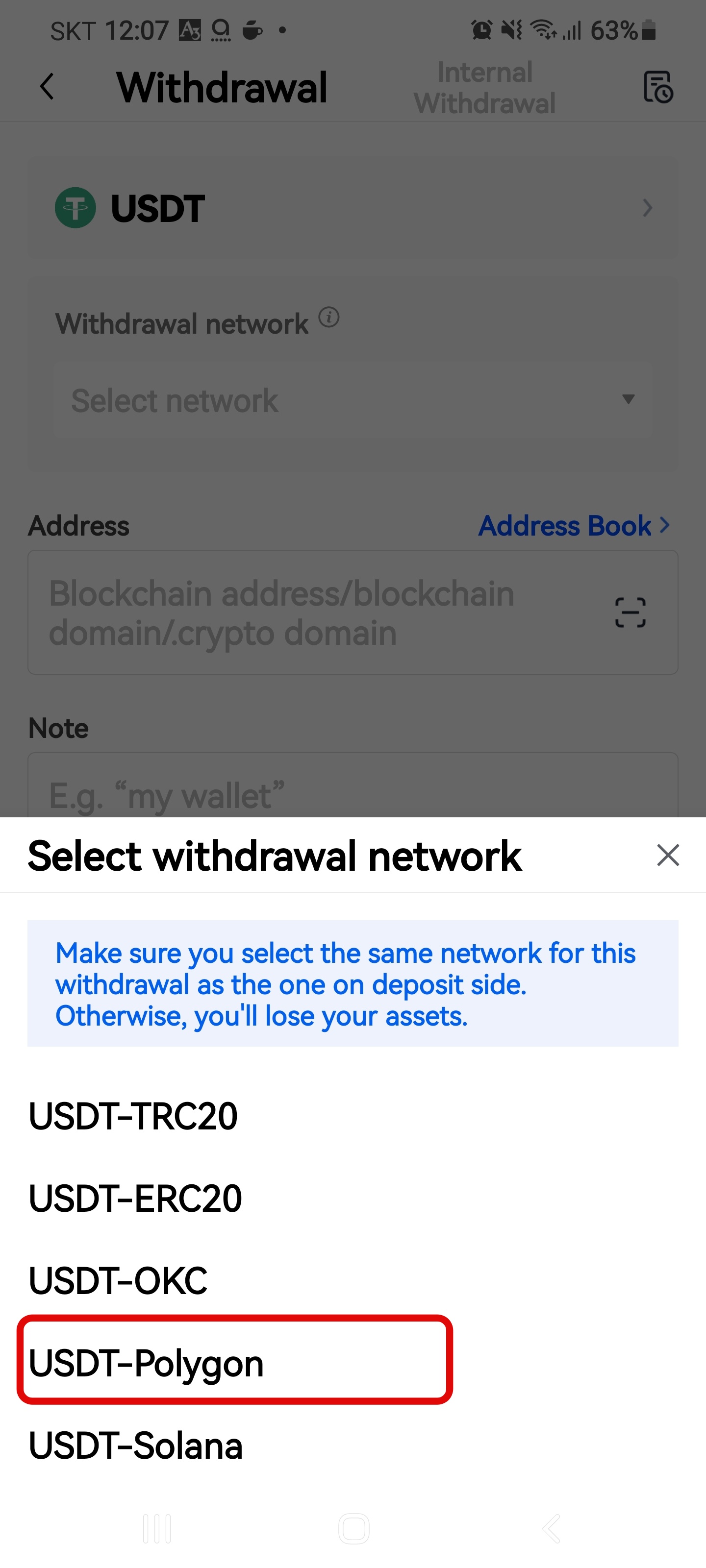 OKX거래소에서 USDT를 폴리곤 메인넷으로 전송을 하실 경우,