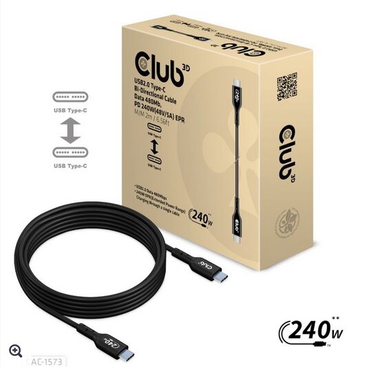 Club3D AC-1573 모델의 USBC 케이블은 240W 전원을 지원하며 길이는 2m이지만 영상 지원은 없고 데이터 전송 속도는 USB 2.0 수준인 480Mbps에 불과하다.
