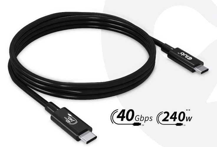 Club3D AC-1576 모델의 USB 케이블은 가장 강력하며 240W 전원 공급은 물론 40Gbps 전속력과 8K60Hz 출력을 1미터의 비용으로 지원한다.