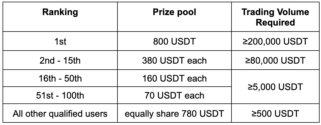 캠페인 기간 중 MESH에서 USDT 500 USDT 이상을 거래하는 이용자는 누적 거래량에 비례해 USDT 1만6,000 USDT 상금을 공유할 수 있다.세부사항은 다음과 같다.