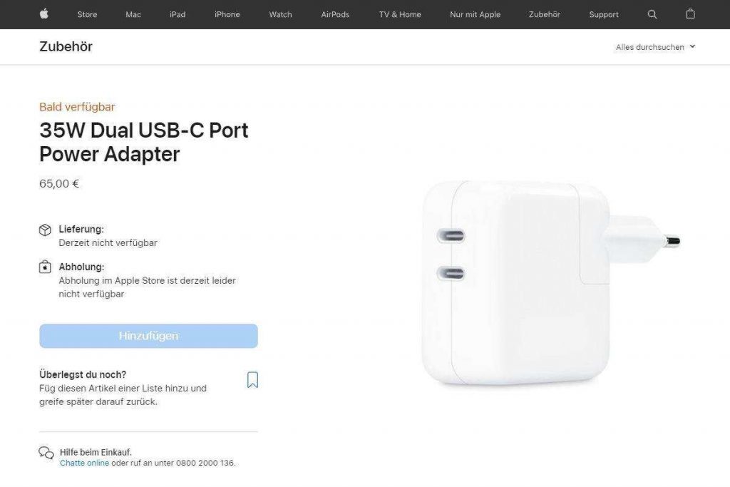 독일 온라인 애플 스토어에 있는 35W 충전기의 가격은 65유로, 약 68달러이다.