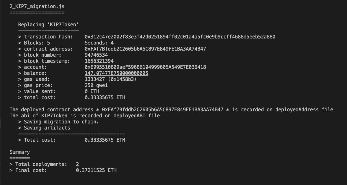 4. 이제 Baobab 테스트 네트워크에 배포할 모든 설정 업데이트들이 있습니다. 아래 커맨드를 실행하면 배포할 수 있습니다.
