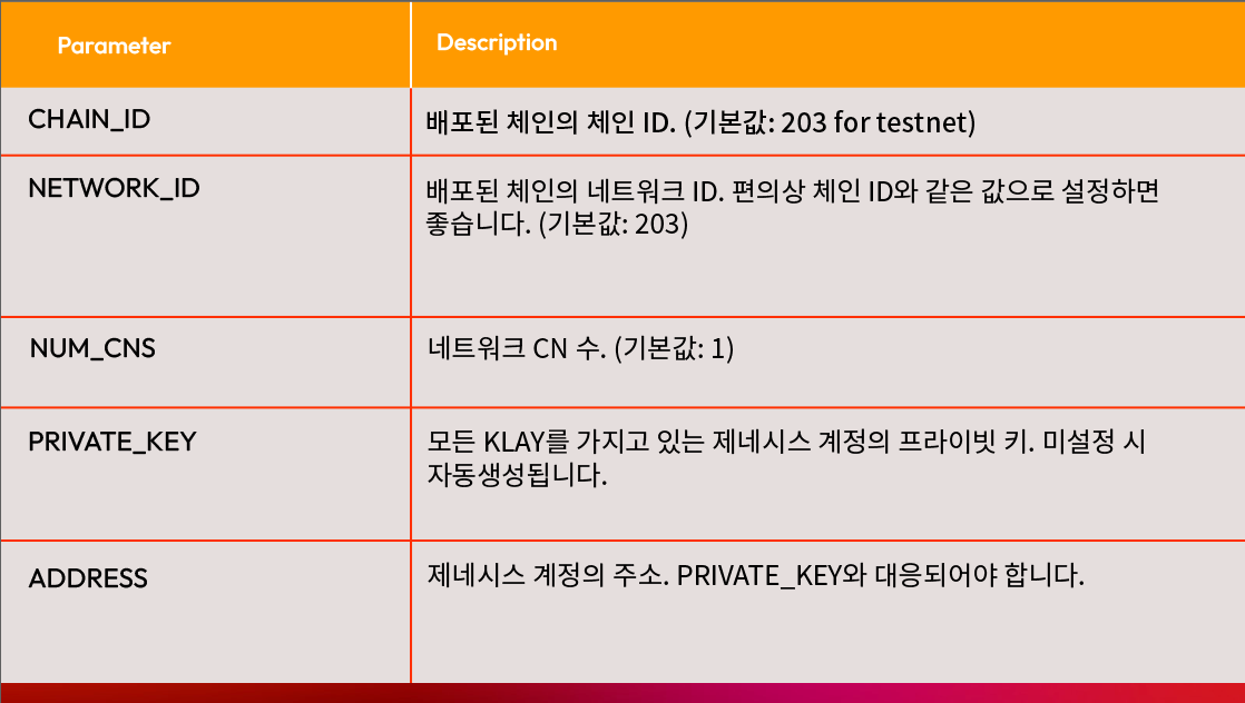 기본적으로 한 개의 클레이튼 컨센서스 네트워크를 배포할 것입니다. prepare 스크립트는 최신 클레이튼 도커 이미지를 다운 받고 도커 컨테이너에 로컬 블록체인 네트워크를 부팅할 것입니다. 아래 파라미터들이 1.prepare.sh에서 테스트넷의 기본값입니다.