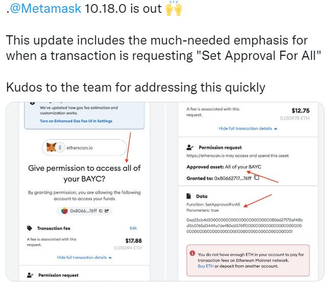 메타마스크가 v10.18.0 을 릴리즈했다고 트위터를 통해 밝혔다. 'setApprovalForAll' 확인 기능을 도입, 악의적인 트랜잭션이 이용자 자금을 탈취하지 못하도록 보안을 강화했다. setApprovalForAll은 사용자