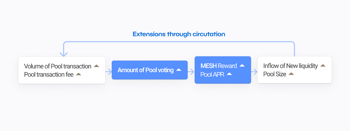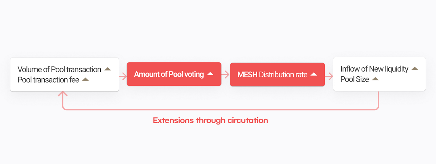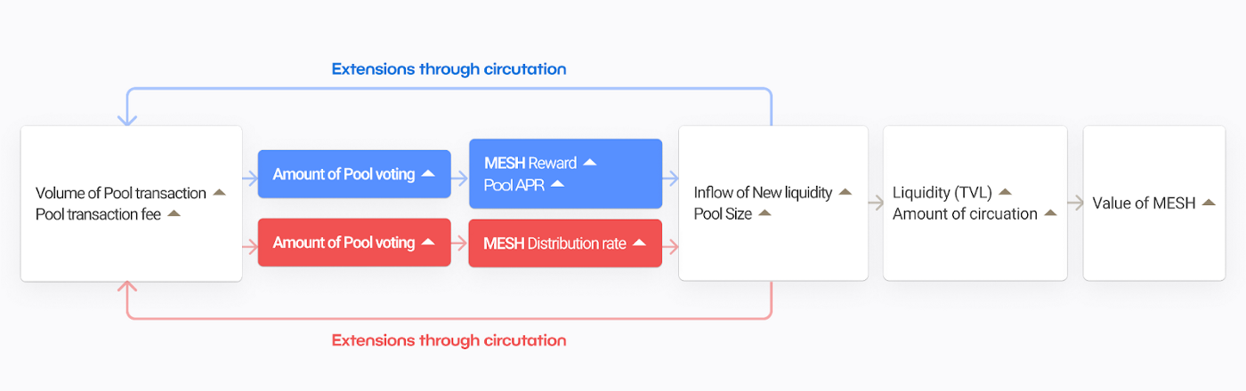 유동성 풀의 거래량이 증가함에 따라 VMESH 보유자는 더 많은 수익을 얻을 수 있으며, 풀 투표 수익과 MESH의 가치가 증가합니다.이것에 의해, vMESH 커뮤니티에 참가하고 싶은 참가자의 수가 확대됩니다.게다가 시장에서의 MESH 수요의 증가와 MESH 스테이킹 레이트의 상승에 의해, 보다 강력한 토큰 분배 구조가 작성됩니다.