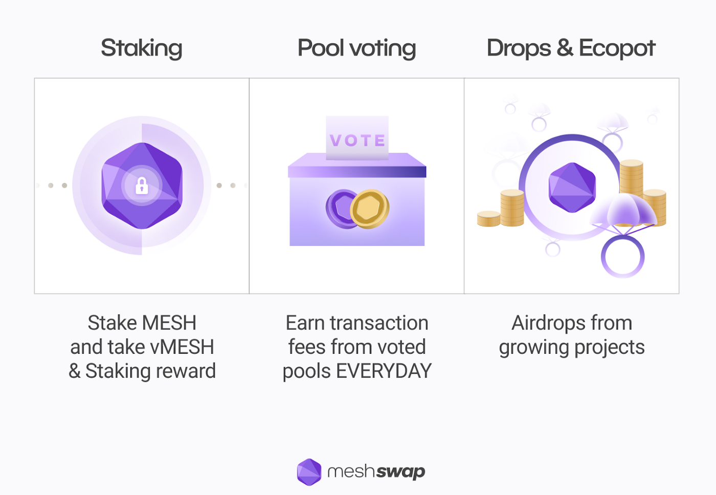 ① mMESH 홀더는 MESH 토큰 이코노미의 핵심 및 핵심 서포터이며, mesh 홀더만이 Meshswap DAO에 참여할 수 있습니다.