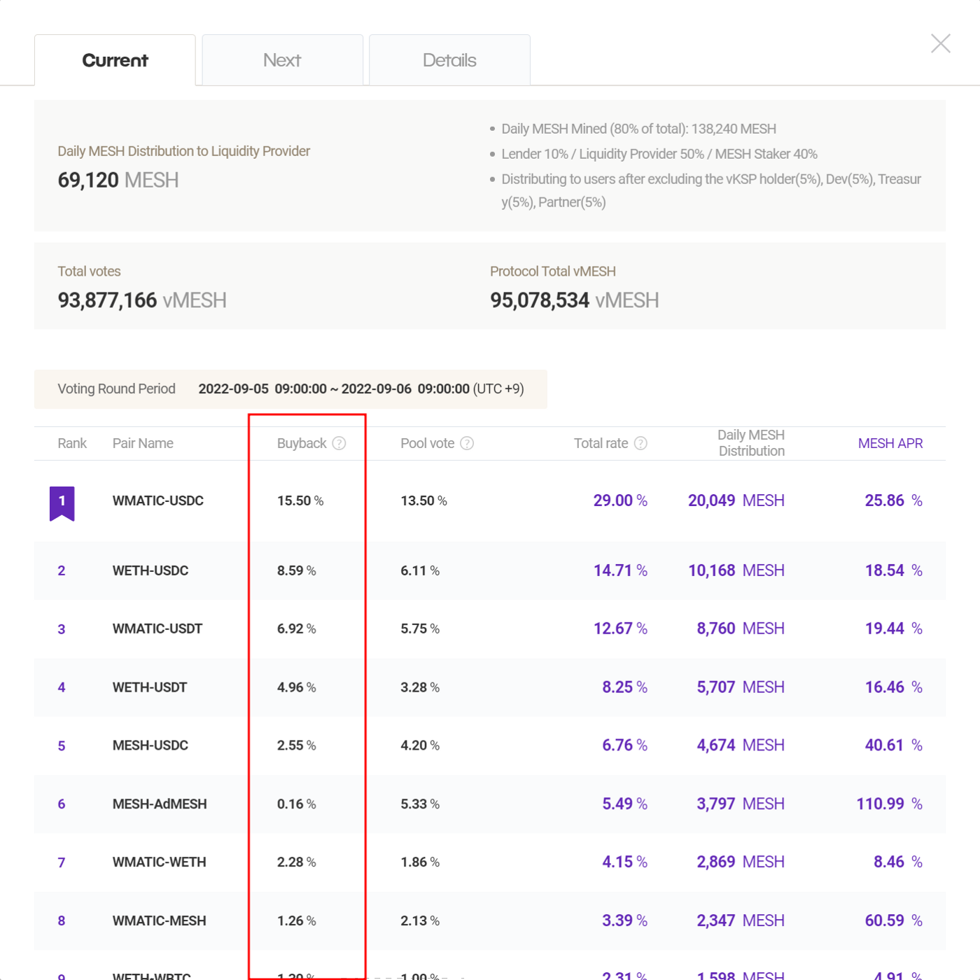 [ MESH Governance ]> [ Staking and Pool ]투표 페이지의 [Pool Bote Status]버튼을 클릭하여 매일 갱신되는 각 풀의 바이백분포, 사용자 투표분포, 총 MESH분포 및 MESH APR을 확인합니다.