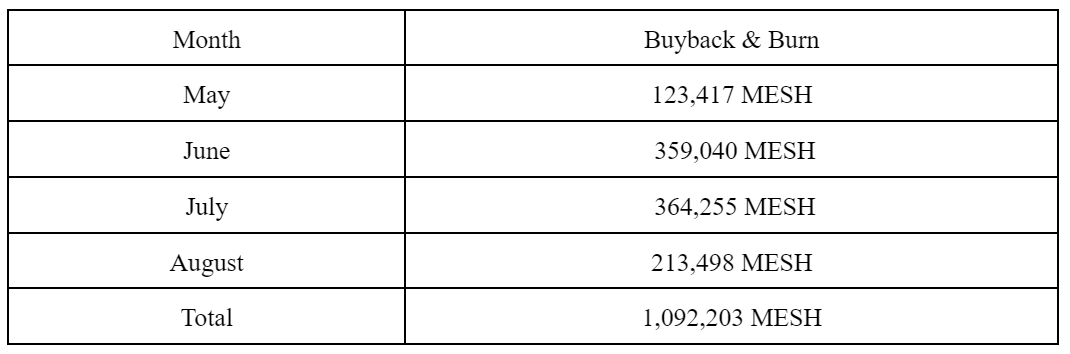 MESH Buyback & Burn은 매일 진행되며, 5월 MESHswap 출시 이후 총 1,092,203.42 MESH가 완료되었습니다.자세한 내용은 다음과 같습니다.
