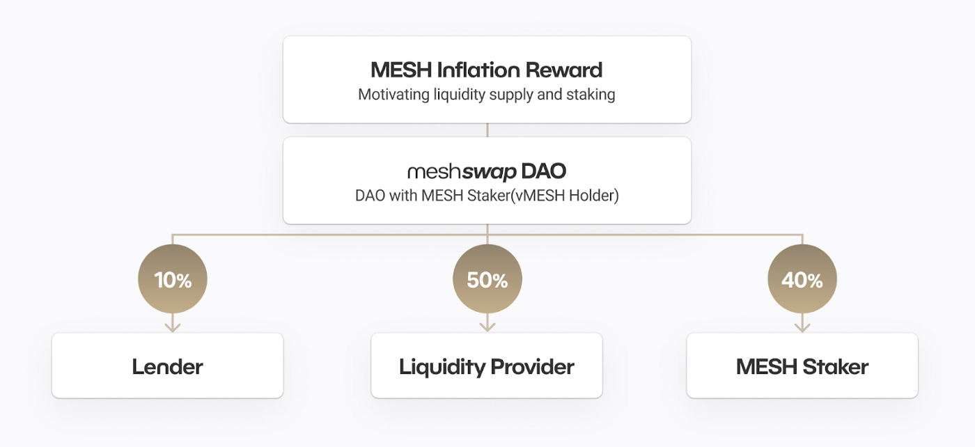 인플레이션과 디플레이션 메커니즘을 조합한 구조에서는 Meshswap의 유동성 풀에서 발생하는 거래 수수료의 50%는 유권자에게 분배되고 나머지 50%는 MESH Buyback & Burn에 사용된다.