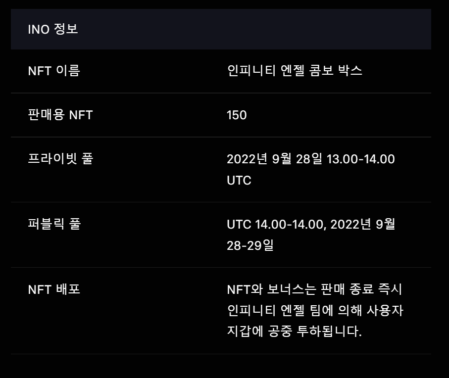 | [Infinity Angel] 인피니티 엔젤 MINTING SALE (0) | 2022.09.29 |