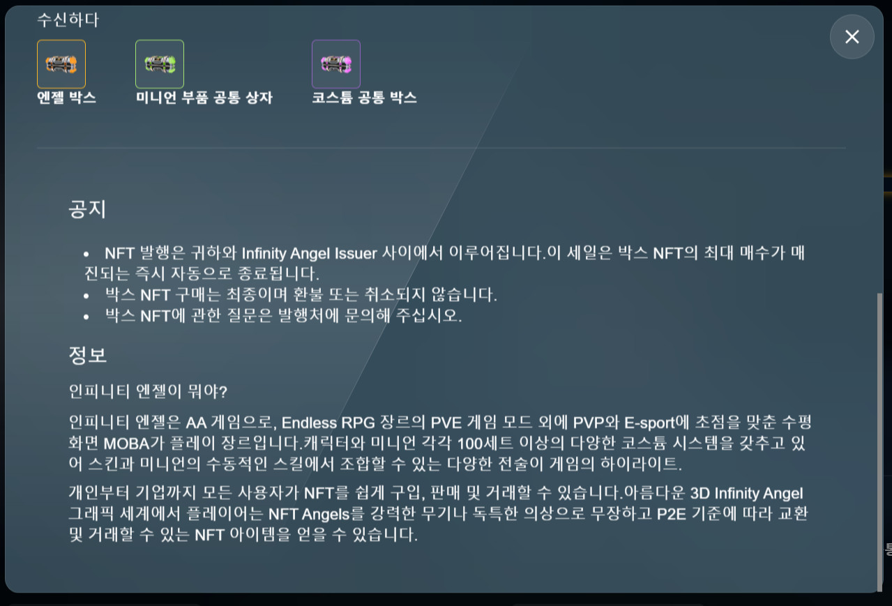 | [Infinity Angel] 인피니티 엔젤 SCHEDULE MINTING SALE (1) | 2022.09.29 |