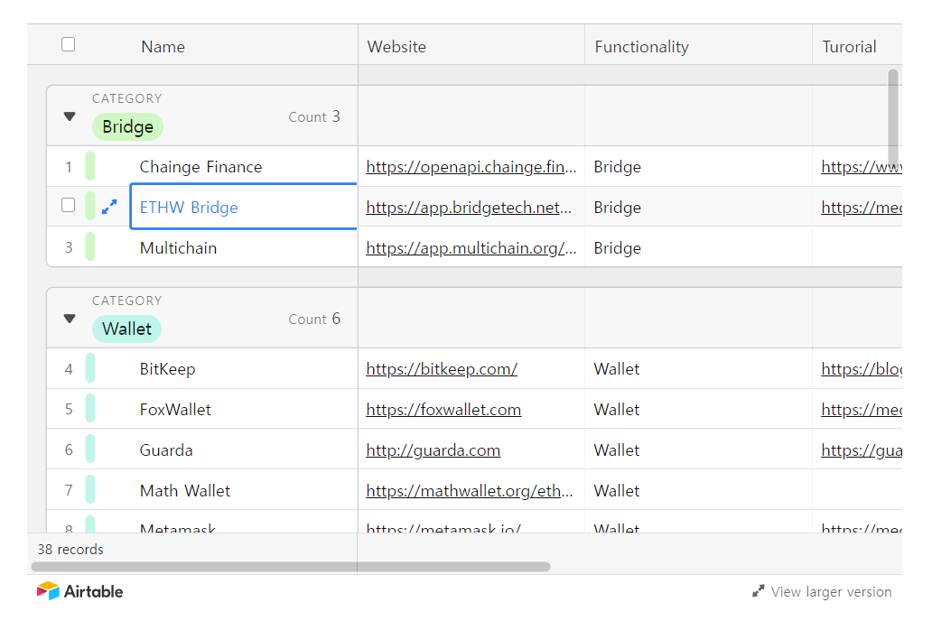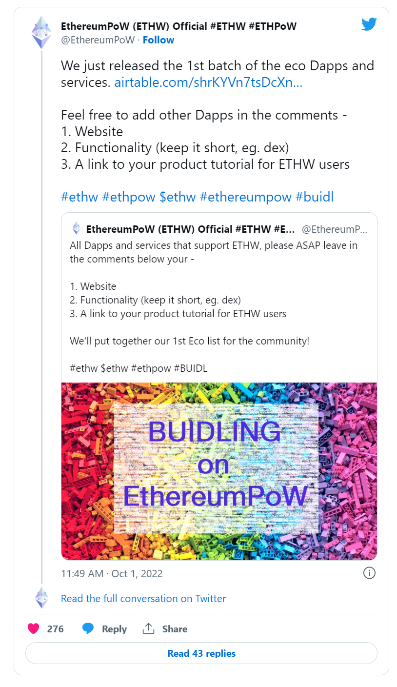 “We just released the 1st batch of the eco Dapps and services. https://t.co/0x0Ym05CKx Feel free to add other Dapps in the comments - 1. Website 2. Functionality (keep it short, eg. dex) 3. A link to your product tutorial for ETHW users #ethw #ethpow $et
