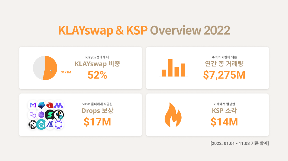 KLAYswap은 2020년 11월 11일 첫 KSP 토큰 분배를 시작으로 클레이튼 네트워크 TVL 절반 이상의 점유율을 자랑하며, 압도적인 1위 DEX로 자리매김했습니다. 다사다난했던 2년 동안 클레이튼의 대표 디파이로서 꾸준히 생태계 확장과 유저 사용 경험 증진을 위해 노력했습니다.