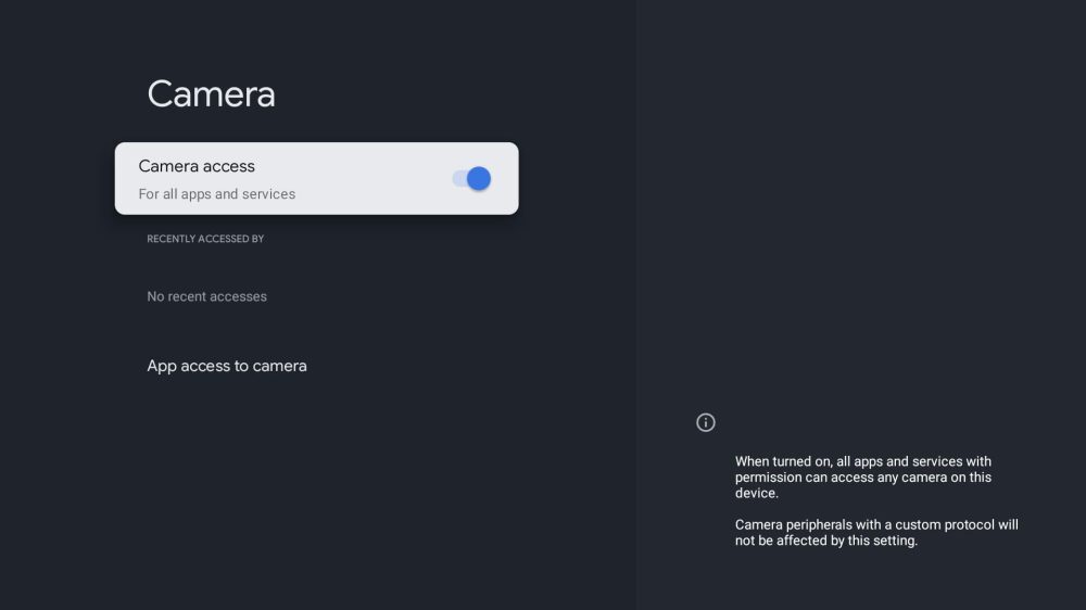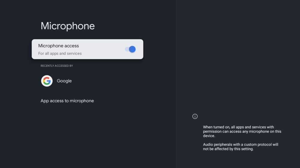 표시기뿐만 아니라 Android 12에서는 마이크 및/또는 카메라에 대한 액세스를 차단하는 방법도 있습니다.Google TV에서는 [설정]> [프라이버시]의 [마이크]섹션 또는 [카메라]섹션에 있습니다.두 페이지 모두 이러한 권한에 액세스를 시도한 앱의 목록도 볼 수 있습니다.