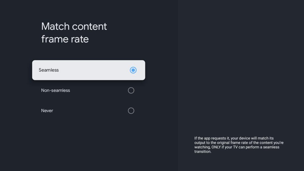 모든 Android TV OS 12 디바이스에서 볼 수 있는 또 다른 새로운 기능은 표시되는 콘텐츠의 프레임 레이트에 맞춰 시스템을 지원하는 것입니다.이것은 Google TV에서 심리스, 심리스, 완전히 오프의 3가지 옵션에서 사용할 수 있습니다.Chromecast(HD)에서는 첫 번째 옵션이 기본적으로 활성화됩니다.