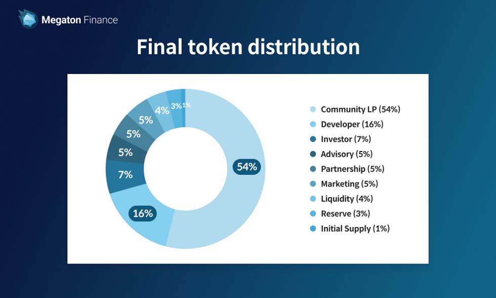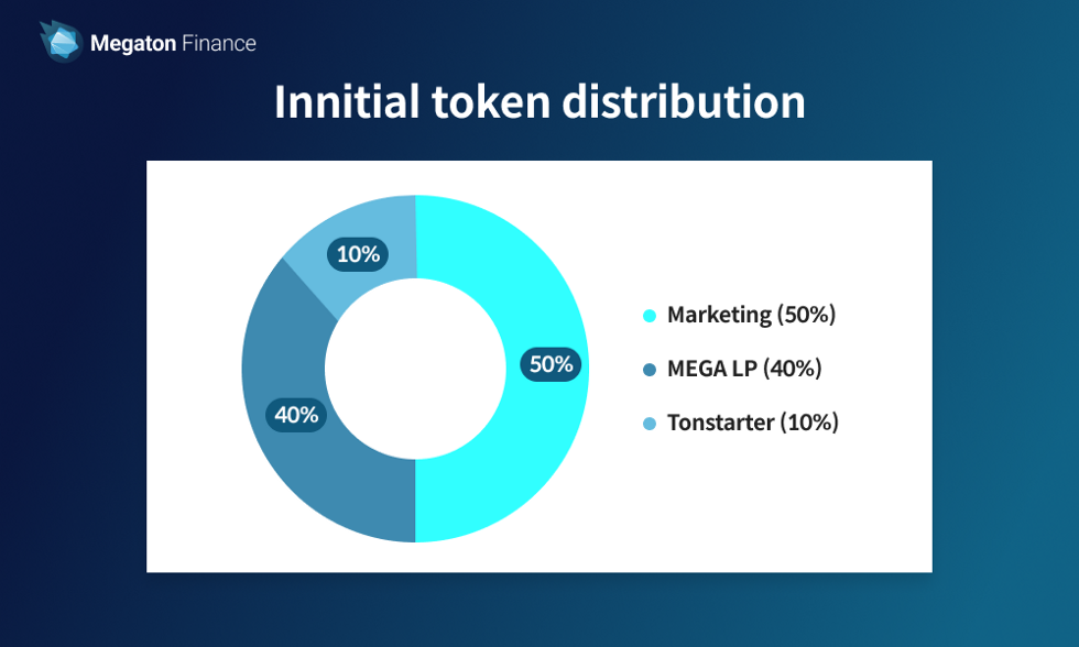 메가톤 파이낸스의 초기 생태계를 구축하기 위해 1,000,000 MEGA(전체 발행량의 1%)를 마케팅, MEGA LP 인센티브 및 Tonstarter에 활용합니다. 메가톤 파이낸스는 초기 공급량을 활용한 이벤트로 사용자와 유동성을 확보해 톤 네트워크상에서 안정적인 거래 환경을 조성할 것입니다.