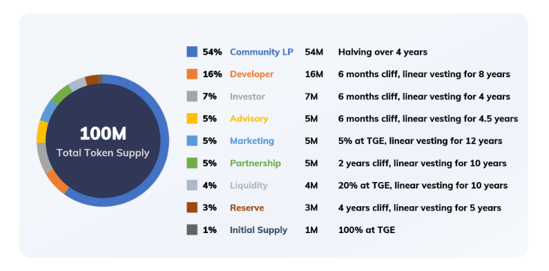 MEGA is a governance token that maintains the ecosystem of Megaton Finance, and the initial quantity issued through inflation is provided to LP (Liquidity Provider). When the staking function is added to Megaton Finance, MEGA staking participants will receive MEGA as a reward. Total supply of MEGA is 100,000,000 MEGA. Community LP is 54,000,000 MEGA(54% of the total supply) and has a halving period(every 4 years).