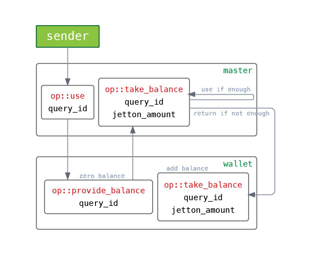 - master receives the money, decides if it has enough, and either uses it (debits something in return) or sends it back to wallet