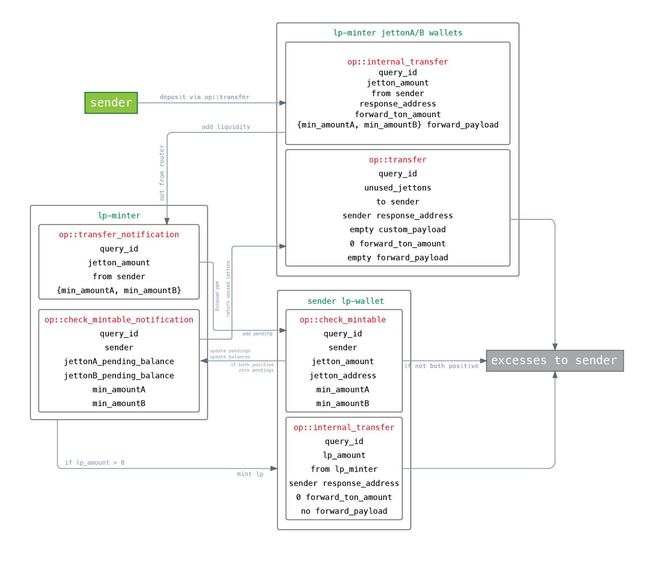 - destination_wallet returns excess gas with op::excesses message on response_destination (usually sender)