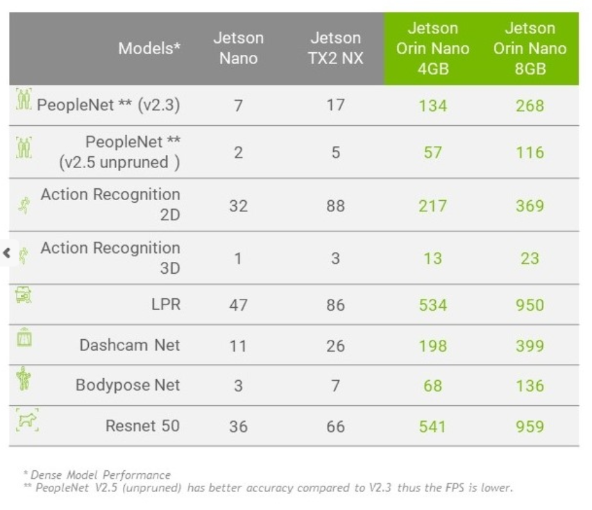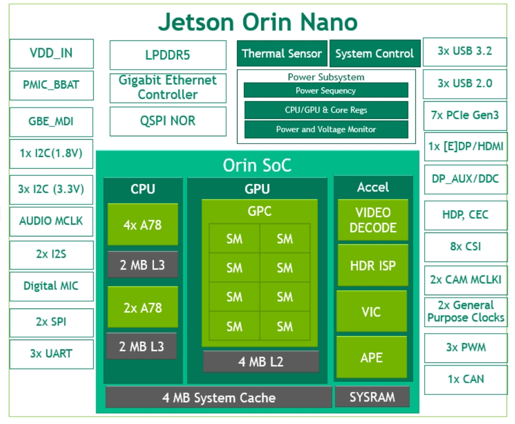 새로운 Jetson Orin Nano는 최대 1.5GHz의 속도로 동작할 수 있는 6개의 ARM Cortex-A78 CPU 코어, LPDDR5 메모리 및 최대 1024개의 CUDA 코어 및 최대 32개의 3세대 텐서 코어를 갖춘 625GHz NVIDIA GPU를 갖추고 있습니다.