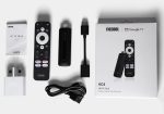 스틱의 크기는 92.5 x 29.5 x 14.5mm(3.6″ x 1.2″ x 0.6″)이며 TV의 전원 및 볼륨 설정을 제어하기 위한 IR 기능도 있는 Bluetooth 리모컨이 함께 제공됩니다.Netflix, Amazon Prime Video, Google Play 및 YouTube의 전용 버튼이 리모컨에 있습니다.