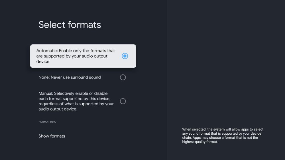 구글 TV 12는 또한 사운드 포맷에 대한 더 많은 제어를 제공합니다.이전 업데이트에서는 장치에서 승인된 것으로 보고되는 사운드 형식을 사용하는 "자동"과 사용자가 액세스할 수 있는 옵션으로 사운드 형식을 강제로 사용하는 "수동" 중에서 선택할 수 있습니다.서라운드 사운드를 완전히 끌 수 있는 "없음" 옵션도 있습니다.