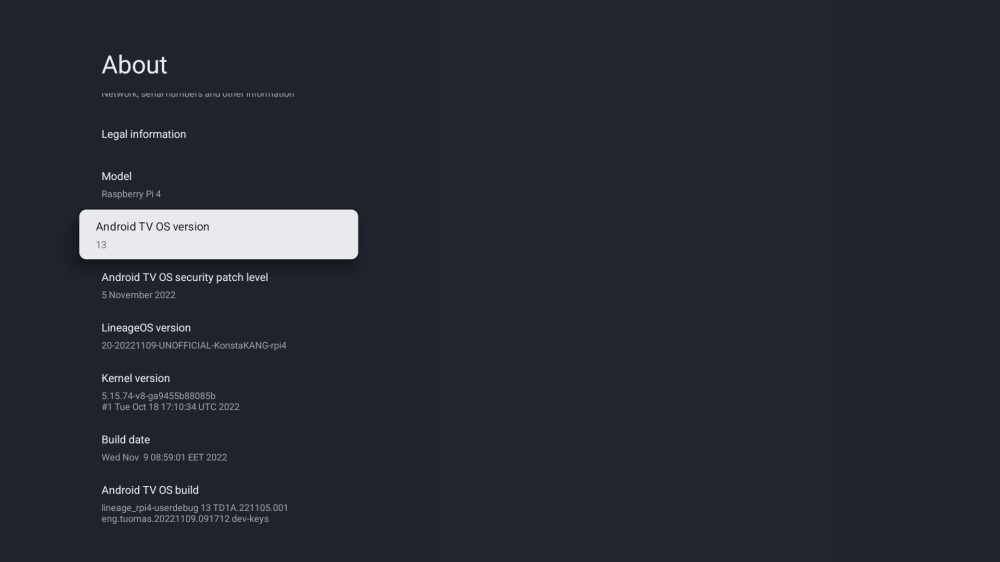 Ported Android TV 버전은 Linage를 사용하여 제작되었습니다.OS와 최신 Android TV 13 베타판 – Google은 아직 Android TV 13의 최종 버전을 출시하지 않았습니다.이 port는구글의 크롬캐스트조차 가지고 있지 않은 2022년 11월 보안 패치까지 탑재하고 있다.구글의기기는12개월 전에 안드로이드를 출시했습니다.