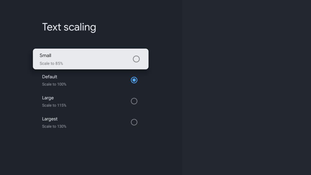 Chromecast의 Google TV 12에서 찾을 수 있는 또 다른 옵션은 텍스트 스케일링입니다.Android에서는 오랫동안 휴대폰이나 태블릿에서 사용할 수 있었지만, 현재는 TV에서도 사용할 수 있습니다.[설정(Settings)]> [디스플레이(Display)]> [텍스트 스케일링(Text Scaling)]에는 85% ~ 115%의 4가지 옵션이 있습니다.가장 작은 텍스트와 가장 큰 텍스트 옵션을 아래에서 비교할 수 있습니다.