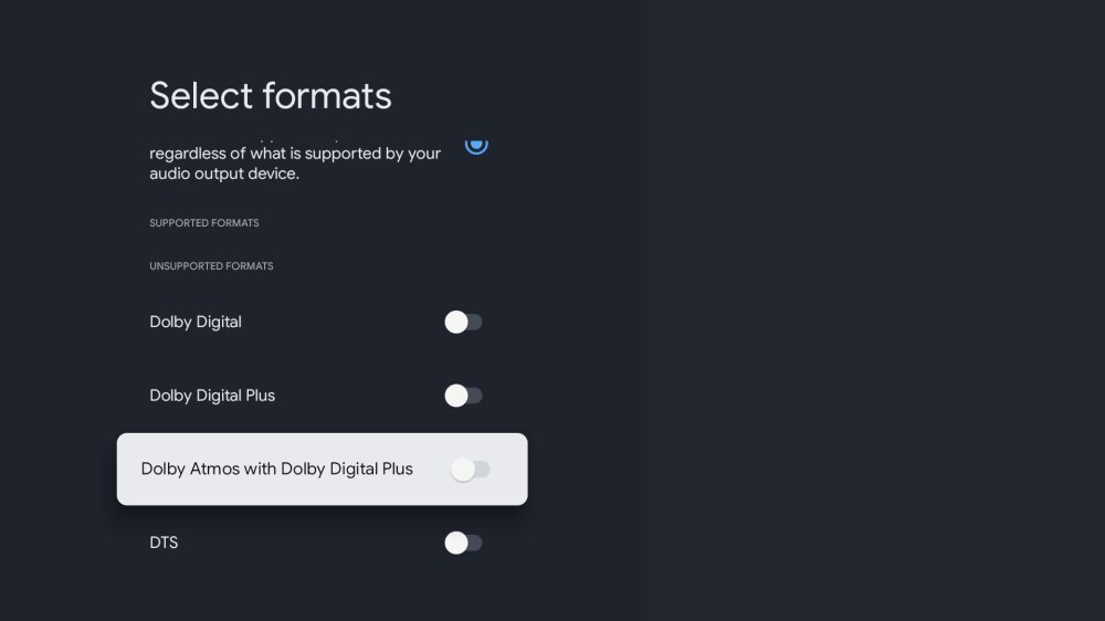 구글 TV 12는 또한 사운드 포맷에 대한 더 많은 제어를 제공합니다.이전 업데이트에서는 장치에서 승인된 것으로 보고되는 사운드 형식을 사용하는 "자동"과 사용자가 액세스할 수 있는 옵션으로 사운드 형식을 강제로 사용하는 "수동" 중에서 선택할 수 있습니다.서라운드 사운드를 완전히 끌 수 있는 "없음" 옵션도 있습니다.