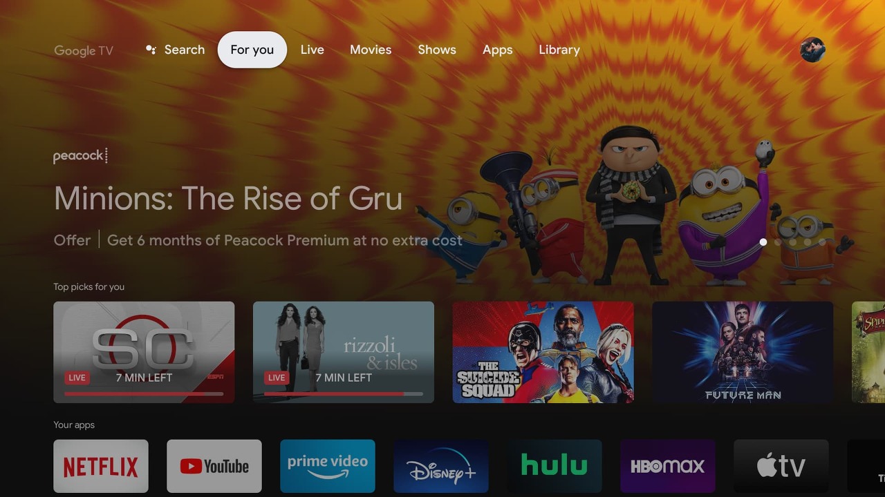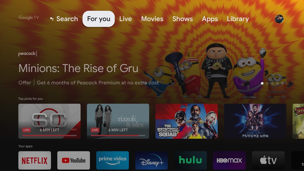 제한된 시간 동안Google TV사용자는미국에서 새 Google TV(또는 기타 Android TV 기기)를 활성화할 때PeacockPremium6개월을 무료로 사용할 수 있습니다. 혜택을 사용하려면 For You 또는 App 탭으로 이동하세요. 당신의 장치.