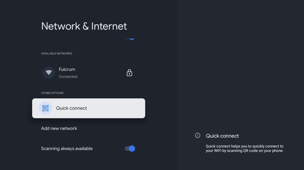 또한 Chromecast의 Google TV 12에서 "Quick Connect"라는 새로운 네트워크 설정을 찾을 수 있습니다.Google이 작년에 확인한 바와 같이, 이 기능은 Android TV 기기(이 경우 Chromecast)를 스마트폰에서 Wi-Fi에 쉽게 연결할 수 있도록 설계되었습니다.