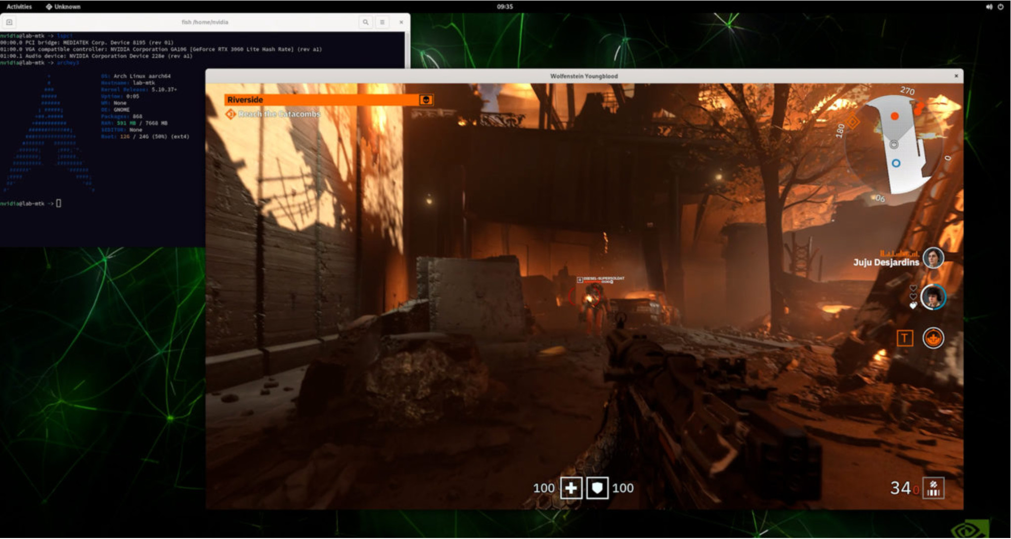 둘 다 MediaTek Kompanio 1200 Arm 프로세서와 결합된 NVIDIA GeForce RTX 3060 GPU에서 시연되었습니다. Wolfenstein: Youngblood 는 id Software에서 만든 idTech 게임 엔진을 사용하고 The Bistro 는 NVIDIA의 샘플 프레임워크를 사용합니다.