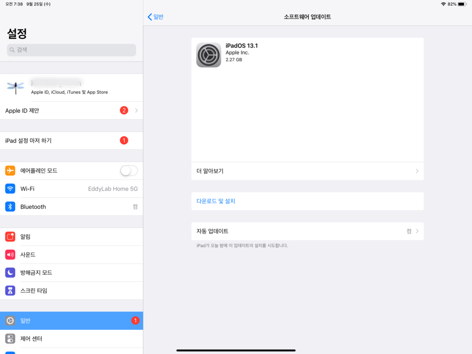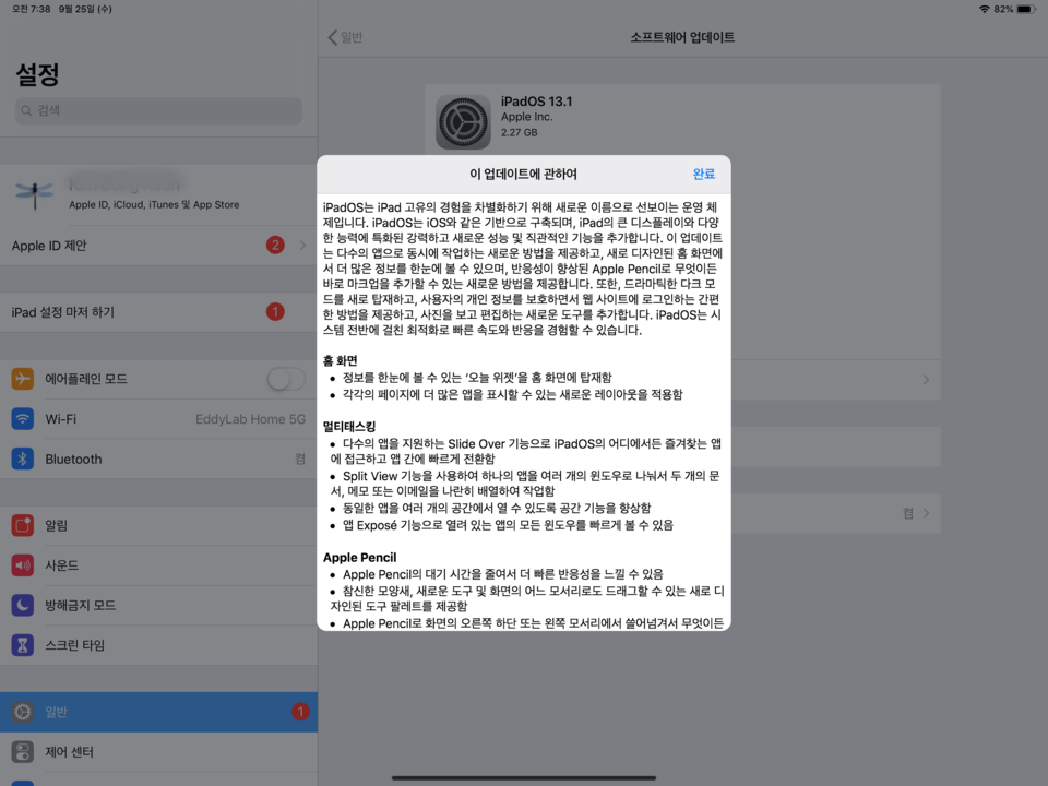 아이패드OS 13.1은 홈화면에 위젯과 다크모드가 들어갔고, 드디어 블루투스 마우스를 사용할 수 있다. 키보드 스탠드가 있다면 노트북처럼 사용할 수 있다. 그런데 매직 마우스와 트랙패드는 지원되지 않는다. 이밖에 손가락 제스처와 멀티태스킹 제스처에도 변화가 생겼고 홈화면에 앱 2개를 동시에 띄울 수 있다. 또한 사파리는 데스크톱처럼 쓸 수 있다. 업데이트 용량은 3GB 언저리다. 업데이트에 필요한 여유 저장 공간을 확보하고 업데이트 실패에 따른 데이터 손실을 막는 백업은 필수다.