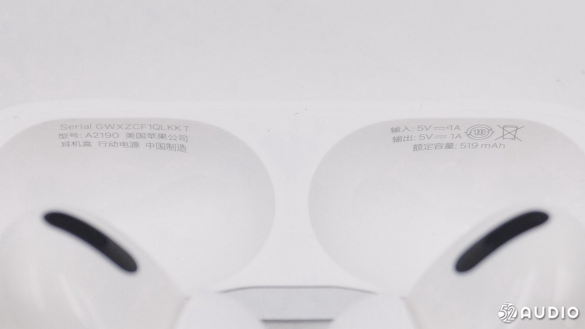 충전 상자 상단의 내부 텍스트 정보 : 모델 : A2190, American Apple, 헤드폰 상자 모바일 전원, 중국 제, 입력 : 5V⎓1A, 출력 : 5V⎓1A, 정격 용량 : 519mAh (PS : AirPods 이어폰 상자의 첫 2 세대 모바일 전원 입력 : 5.2V ⎓ 2.4A, 출력 : 5V ⎓ 1A).