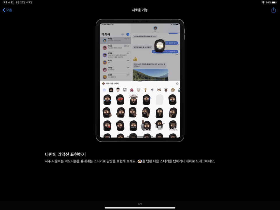 새로운 헤어 스타일, 모자, 메이크업, 귀걸이 등의 새로운 미 문자 사용자 정의 옵션 나 문자 스티커 팩이되어 "메시지", "편지"및 타사 App에 등장.iPad mini 5, iPad (5 세대 이상), iPad Air (3 세대) 및 모든 iPad Pro 모델에서 사용할 수 있도록 승인하며, 또한 나 문자도 선택적으로 친구들과 공유 할 수 지능형 제안과 결과의 카테고리 화하여 메시지를 쉽게 찾을 수있는 검색 기능을 강화