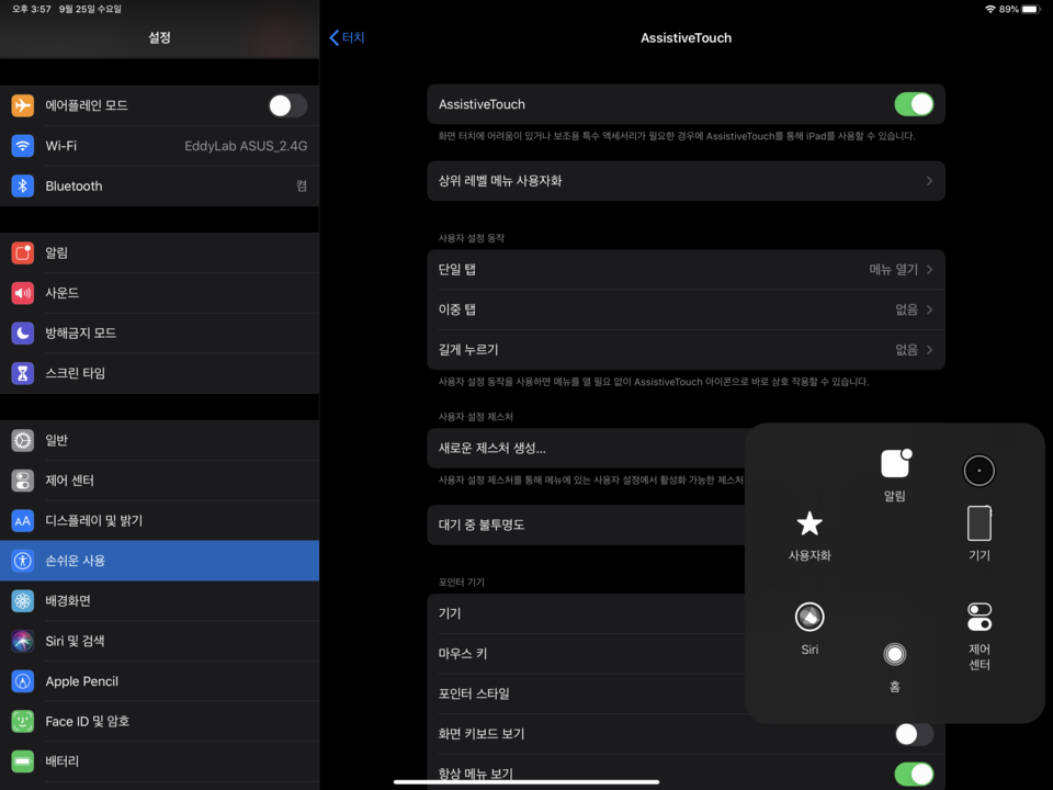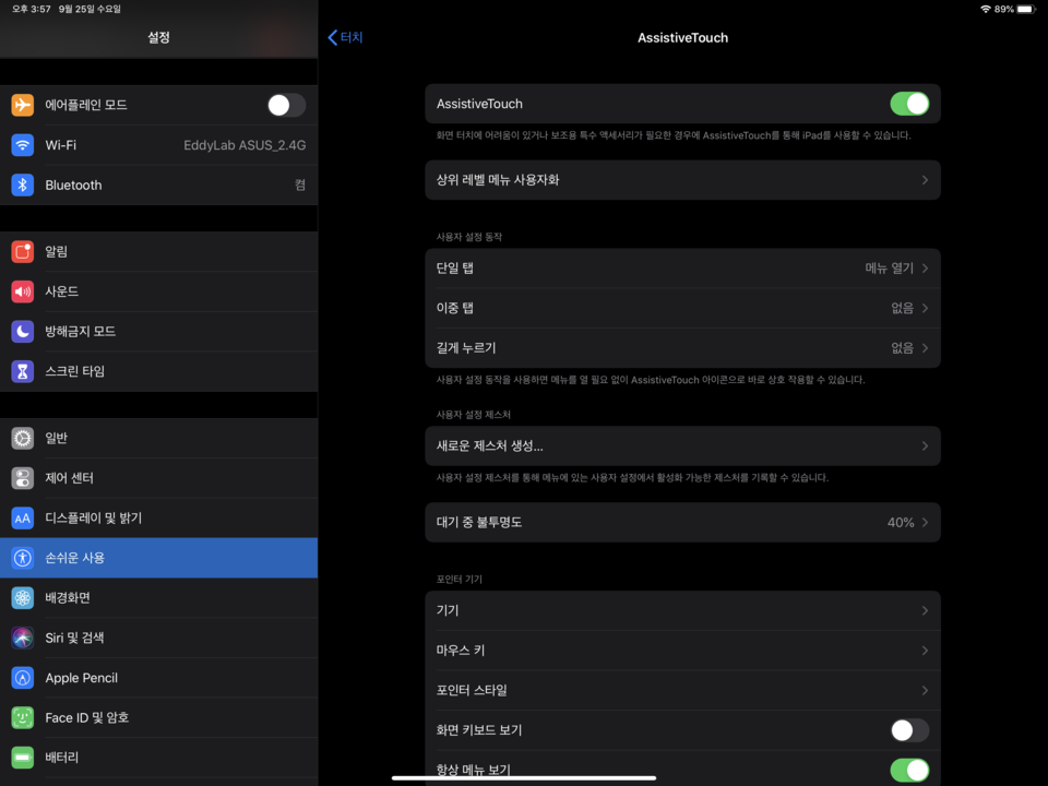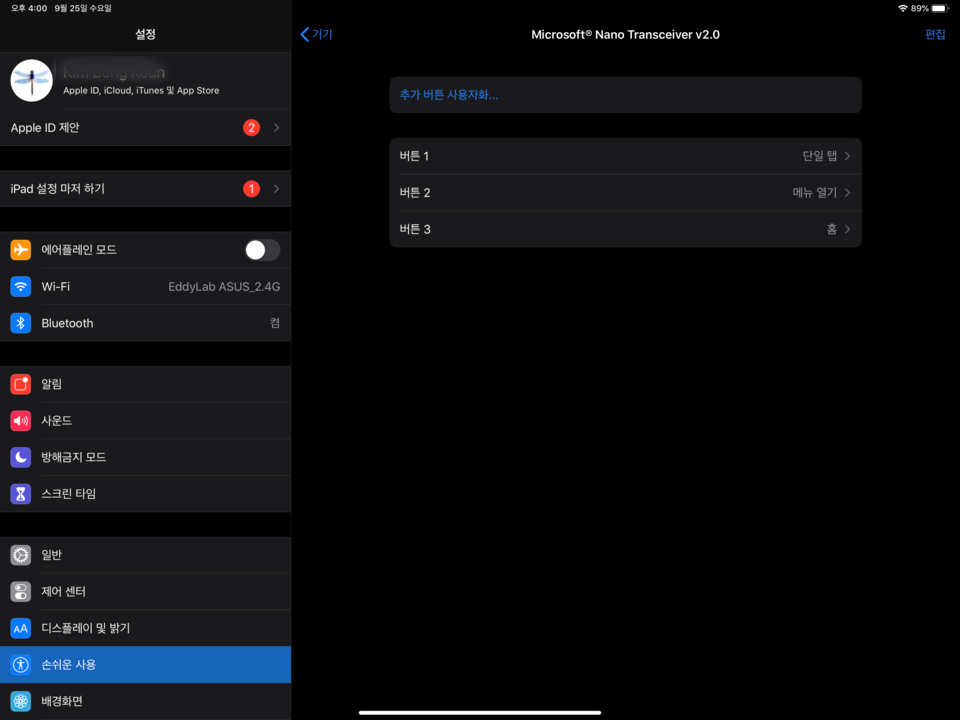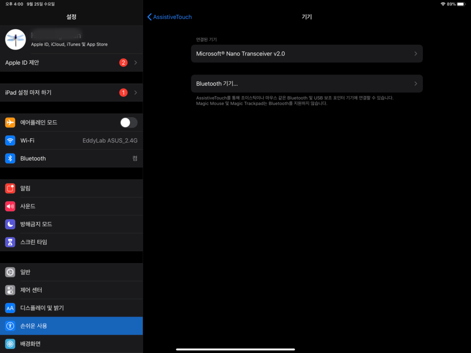 AssitiveTouch에서 기기를 선택해보면, 현재 연결한 기기 정보를 보실 수 있습니다. 저는 test용으로 WiFi MS 키보드 / 마우스패드를 꼽아서 사용하였습니다.