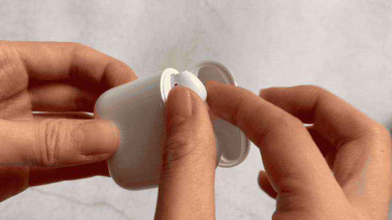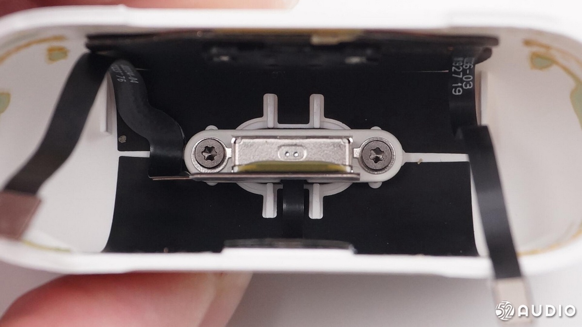 힌지 커버와 하부 충전 케이스 걸쳐 위로 근접이 AirPods 프로 금속 본체 케이스 충전 이전의 두 가지 버전은 유선 및 충전 케이스 충전 카트리지의 무선 버전 힌지 본체 하부에 위치한다.힌지 아래에 페어링 버튼이 있으며 실제 측정은 iPhone 인터페이스 작동을 통해 수행 할 수 있으며 페어링 버튼을 누를 필요가 없습니다.이 버튼은 Android 기기와 페어링하는 데 사용할 수 있습니다.