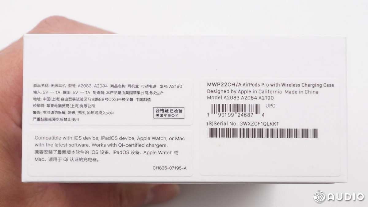 오른쪽 스티커 영어 번역 : AirPods Pro (무선 충전 박스 포함), 캘리포니아 Apple에서 설계, 중국 제, 모델 : A2083, A2084, A2190.텍스트 아래에는 제품의 바코드 정보가 있습니다.