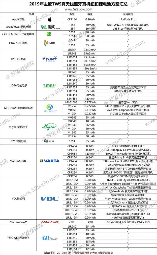 오디오 네트워크를 좋아하는 거의 100 개의 TWS 진정한 무선 블루투스 헤드셋에 대한 과거 보고서의 데이터 정렬을 통해 저는 모든 사람들이 선택할 수있는 다음과 같은 국내 주요 버튼형 리튬 배터리의 유명한 기업에 왔습니다.