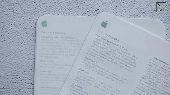 왼쪽 상단의 스티커 정보 : 제품 이름, 무선 헤드셋 모델 : A2083 오른쪽 귀, A2084 왼쪽 귀 (PS : 1 세대 모델 : A1523 오른쪽 귀, A1722 왼쪽 귀; 2 세대 모델 : A2031 오른쪽 귀, A2032 왼쪽 귀), 헤드폰 박스 모바일 전원 모델 : A2190 (PS : 1 세대 및 2 세대 유선 충전 박스 모델 : A1602; 2 세대 무선 충전 박스 모델 : A1938).