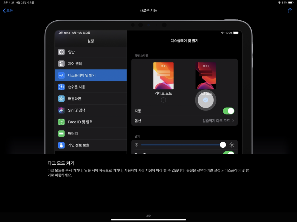 저조도 환경에서 훌륭한 시청 경험을 가지고, 새로운 다크 색상 일몰이나 특정 시간에 자동으로 켜지도록 예약 할 컨트롤 센터에서 선택 할 수 외관이 라이트 모드 다크 모드가 자동으로 전환, 4 개의 새로운 시스템 배경 화면