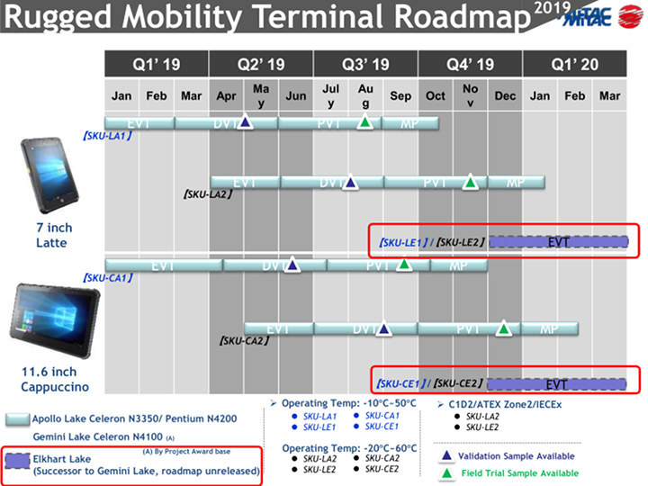 두 번째 마더 보드는 2020 년 1 분기에 계획된 PD11EKI mini-ITX 임베디드 마더 보드입니다. 마지막으로 MITAC은 2019 년 12 월에 엔지니어링 샘플 (EVT = Engineering Verification Testing)을 사용하여 Intel Elkhart Lake 기반의 견고한 태블릿을 출시 할 계획입니다.