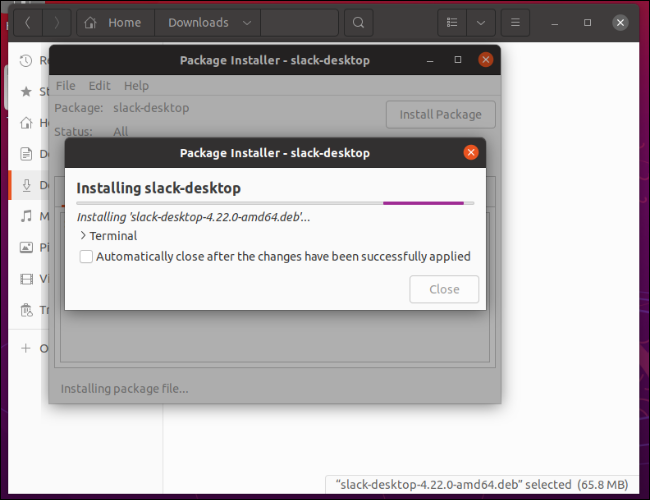 또는 기본 파일 관리자를 사용하여 파일 위치로 이동하고 를 입력 sudo dpkg -i하고 파일을 터미널에 끌어다 놓고 Enter 키를 눌러 설치할 수 있습니다.