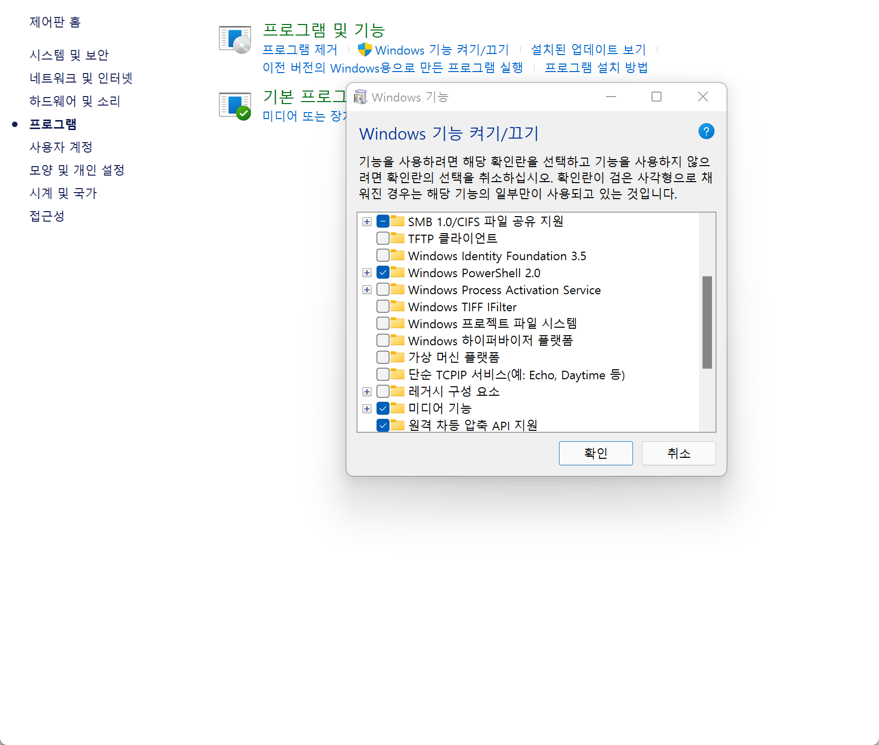 Windows 기능 설정 또는 해제를 검색하고 맨 위의 결과를 클릭하여 환경을 여십시오.