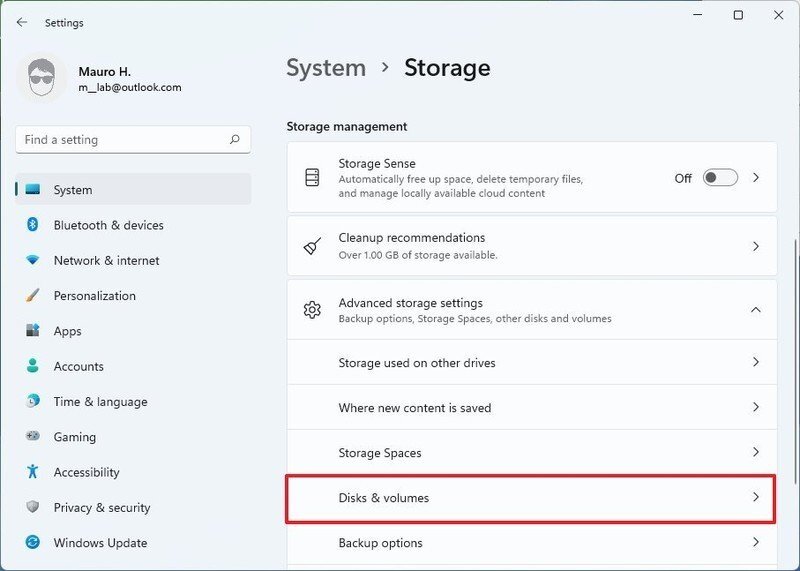 저장소 관리 섹션에서고급 저장소 설정옵션을 선택하십시오.